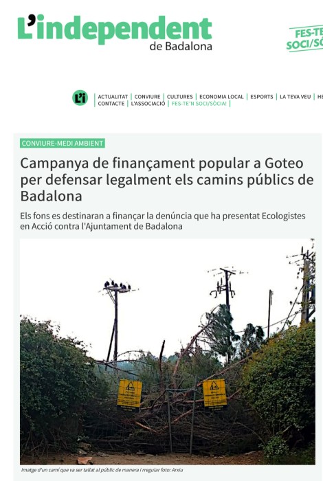 Ara és molt important que, en la mesura que pugueu, ens ajudeu a donar a conèixer aquesta campanya i la defensa dels camins públics a tots els contactes que pugueu. L'enllaç és goteo.cc/defensemcaminspublics . Encara ens falta un bon tram per aconseguir tots els fons que ens calen per sufragar els costos d'aquestes proves pericials que han de demostrar davant la justícia que tenim raó i l'Ajuntament de Badalona ha de rectificar... Que ningú no es quedi sense participar en aquesta defensa conjunta dels camins públics!