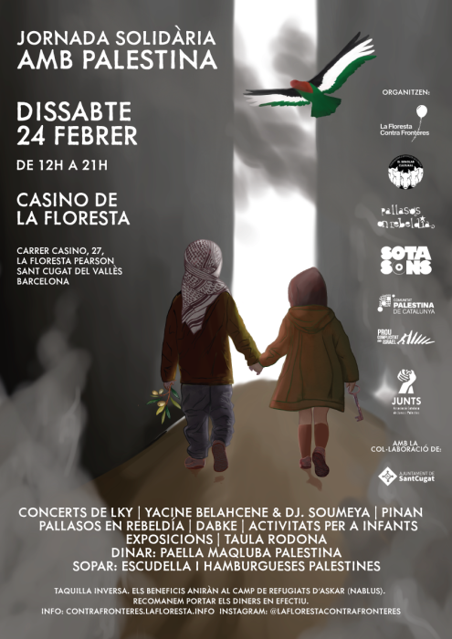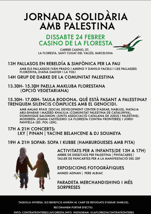 Contactem de nou amb vosaltres per convidar-vos a venir a la jornada solidària amb el poble palestí que diverses entitats hem organitzat pel proper 24 de febrer de 12h a 21h. La jornada comptarà amb activitats infantils, mostra de dansa Dabke local, taula rodona per debatre la situació actual a Palestina, concerts i per descomptat àpats solidaris (dinar i sopar) entre d'altres sorpreses. Tots els beneficis de la jornada seràn destinats al Centre per al Desenvolupament Social d'Askar que arrel del 7 d'octubre ha perdut el seu patrocini i per tant la possibilitat de continuar el seu projecte. Actualent el camp de refugiats d'Askar està també acollint persones desplaçades de la franja de Gaza. Ens agradaria molt comptar de nou amb el vostre suport i presència. Us adjuntem els cartells de la jornada. Us hi esperem!!!!